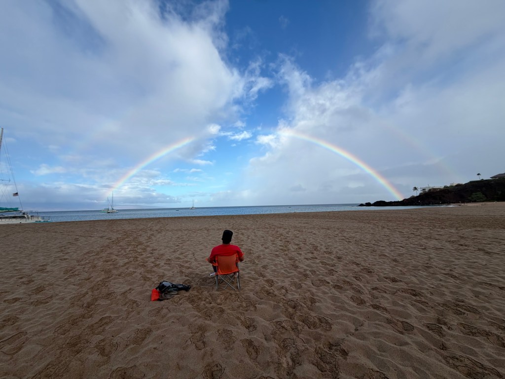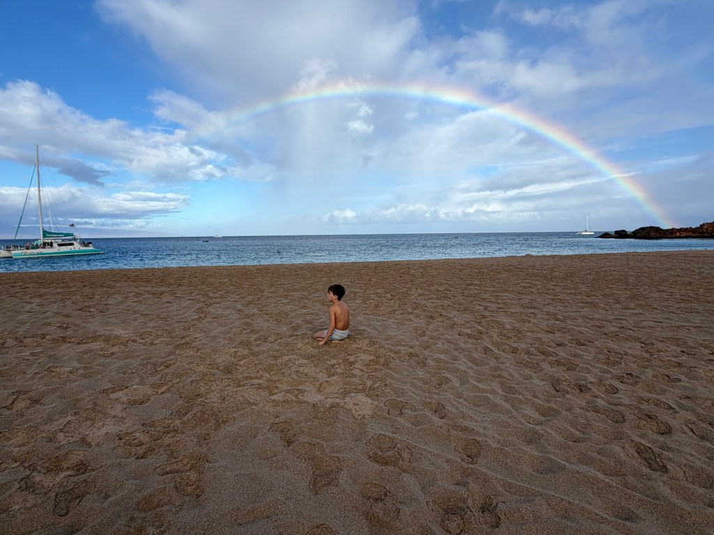 This fall we got to go to Maui, my in-laws treated us with an incredible trip. One morning we awoke to a sunrise and rainbows. We sat on the beach and watched the rainbow…unbroken cover the entire sky. Then a double rainbow came. Then my little nephew played in the sand under the rainbow canopy. Then, we sat in our lawn chairs and looked and looked at it. The rainbow stayed for so long.